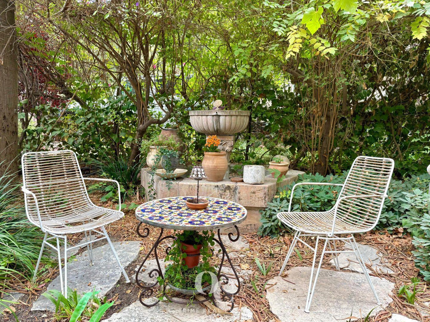 A lush and pastoral garden surrounded by greenery and ancient trees, with charming sitting areas and full privacy. The garden includes ample space for a large Sukkah and for peaceful outdoor relaxation.